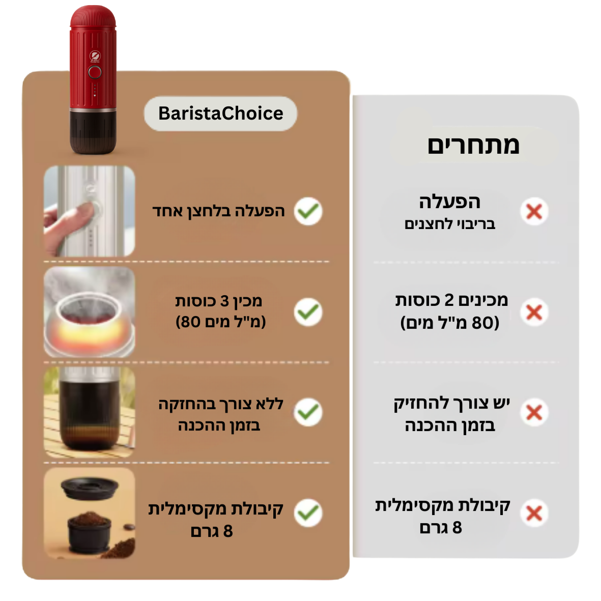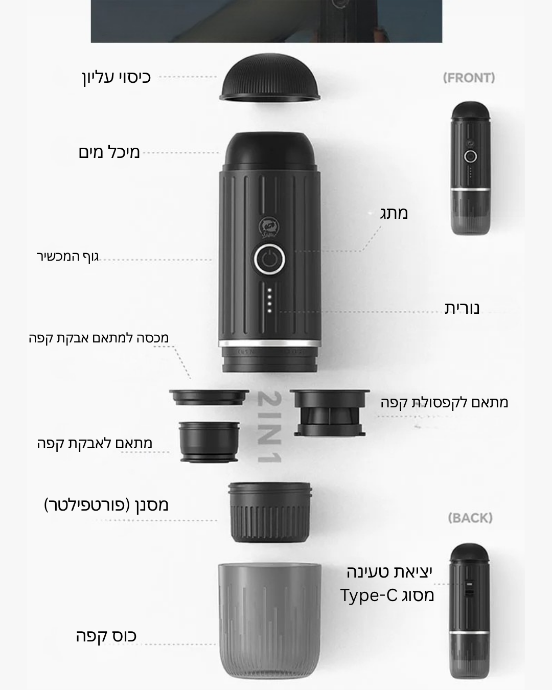 כל זה הרבה יותר נוח ויעיל מהשיטות הקיימות להכנת קפה טרי – כמו מקינטה עם גזייה, או מכונת קפה ידנית ניידת יחד עם תרמוס מים חמים.